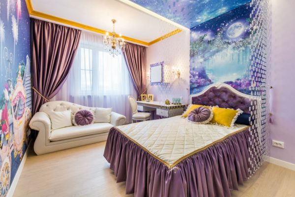 Dans la chambre des enfants, il est conseillé aux créateurs d'appliquer avec audace tout le spectre de la teinte violette. Pour la chambre des filles, vous pouvez utiliser la couleur lilas avec des nuances roses, pour les garçons, elle aura l'air bien lilas avec du gris.