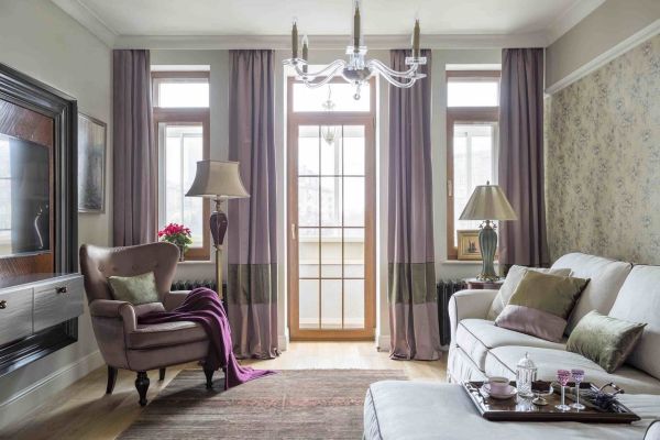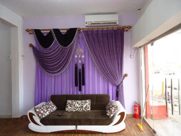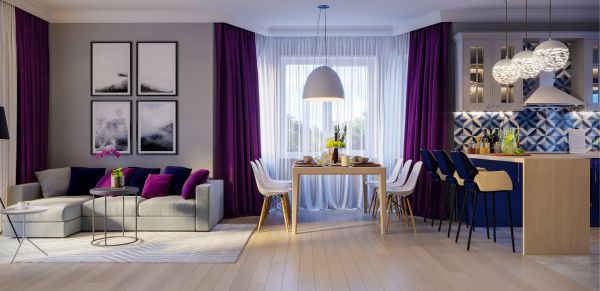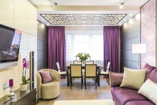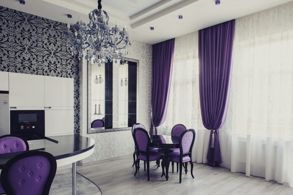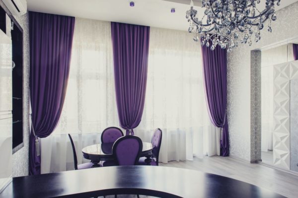 Avant de ramasser les rideaux violets pour le hall ou le salon, vous devez considérer complètement la conception de la pièce.