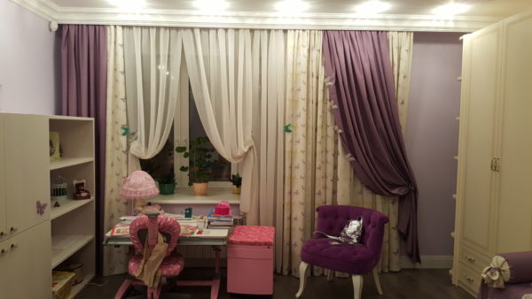 Les rideaux de couleur lilas confirmeront le style pop art. Le ton est capable de souligner le caractère démonstratif de la pièce, vous pouvez la diluer avec des éléments de décoration citron ou vert clair.