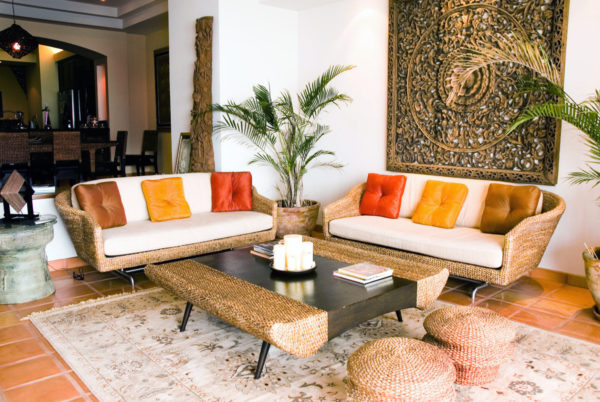 En règle générale, l'utilisation de chaises et de canapés en bois ou en rotin, recouverts de tapis lumineux.