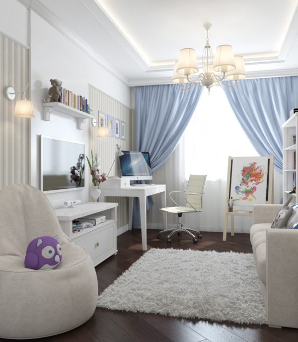 Les tons bleus et blancs et froids ne rendent pas la pièce inconfortable ou austère. C'est une excellente option pour une adolescente avec une coiffeuse et des meubles rembourrés. Un tapis moelleux et un plafond tendu surélevé, harmonisant l'impression générale, confèrent à la pièce un charme particulier.