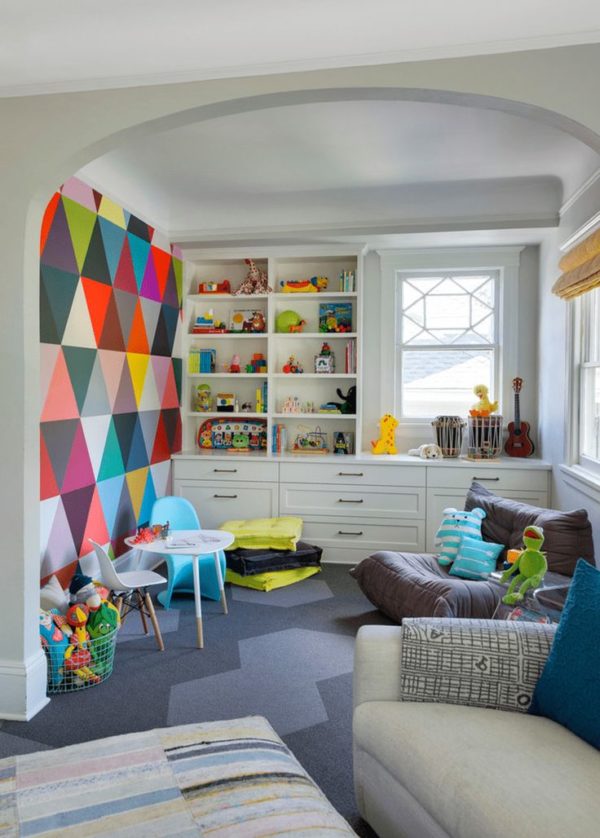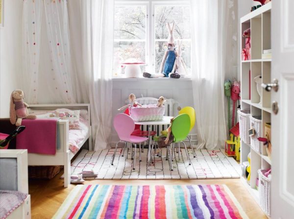 Les structures d'angle occupent un espace auparavant inutile, des casiers sont situés au sol du canapé et des peintures lumineuses sur le mur (l'enfant lui-même peut les dessiner) agrandissent visuellement la pièce, comme des rideaux sur la fenêtre, et non sur le rebord du plafond.