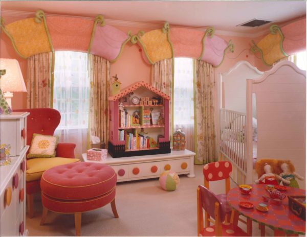 Beau style aux couleurs vives pour une fille d'âge préscolaire, lumineux et coloré, décidé par le designer dans la version originale. Il est peu probable que de tels meubles soient vendus dans un magasin ordinaire, mais la pépinière est magnifique et frappante à première vue.