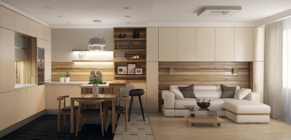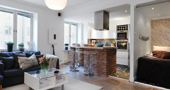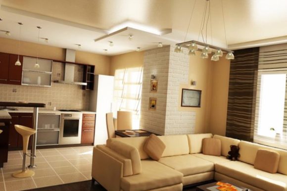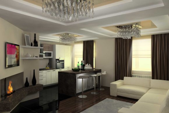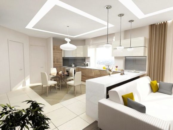 Il y a plusieurs projets de cuisine combinés avec le salon. Tout dépend de la taille des chambres, du but et des finances. Il convient de considérer les méthodes de zonage les plus courantes: