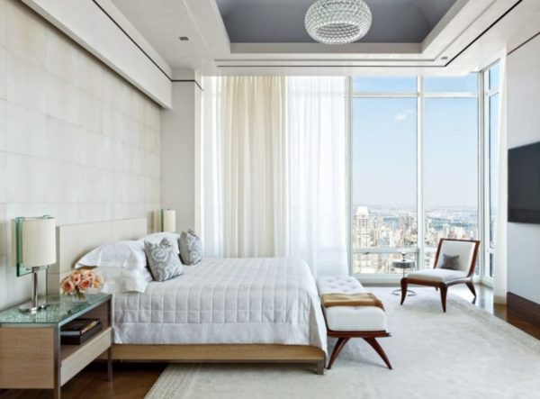 - Une grande fenêtre panoramique rend l'intérieur de la chambre visuellement plus large et plus léger. Les objets sombres ne se gâteront pas, mais le compléteront plutôt favorablement.
