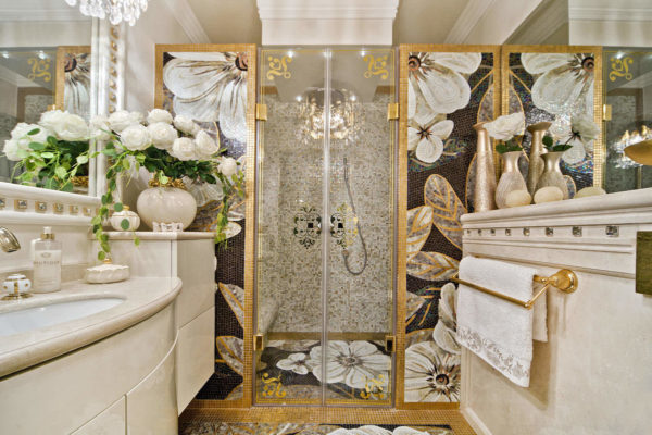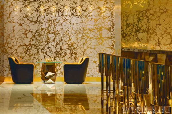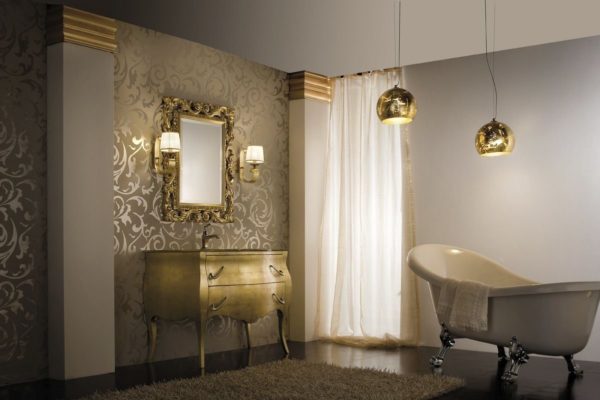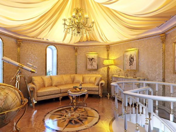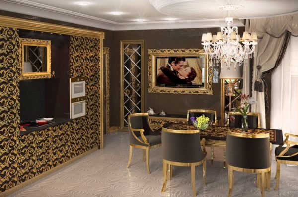 Les règles traditionnelles du bon goût, développées au cours des siècles d'utilisation de l'or dans les intérieurs grandioses, ne recommandent pas de combiner les surfaces mates et brillantes dans cette version de l'intérieur. Cependant, maintenant, lorsque l'éclectisme domine dans des directions à la mode, cela est permis. Il est seulement important qu'ils ne soient pas situés à proximité.