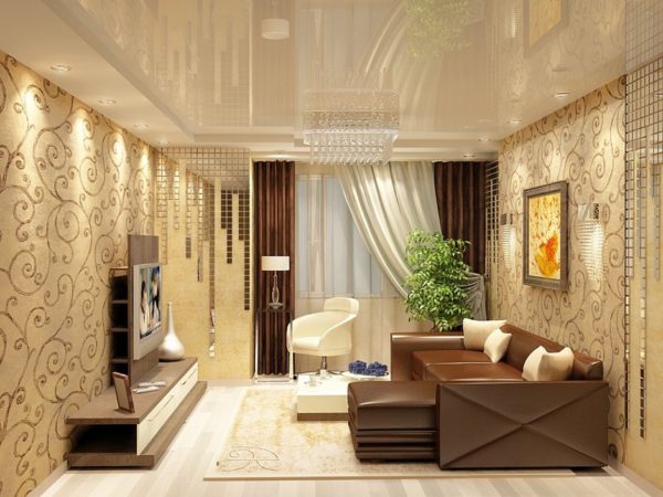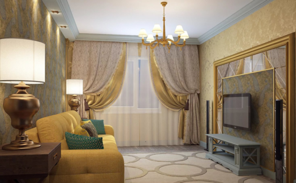Une bonne solution dans un dicolor doré et gris-beige. Il a l'air très moderne, car deux astuces sont utilisées - la solution exactement opposée au mur au-dessus du canapé et des zones d'écran du téléviseur, des doubles rideaux drapés sur des arcs et un tapis léger avec un motif géométrique. La douce harmonie des tons vous donnera l'occasion de vous détendre après une journée bien remplie.