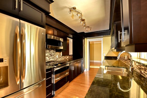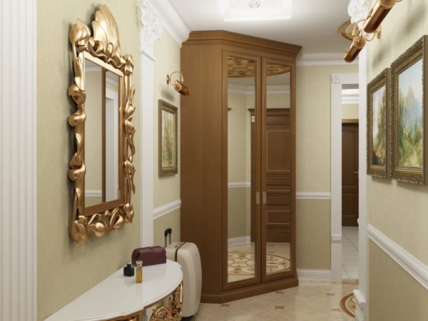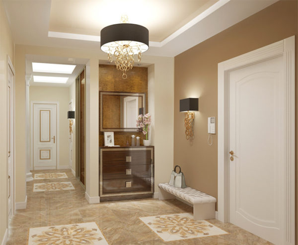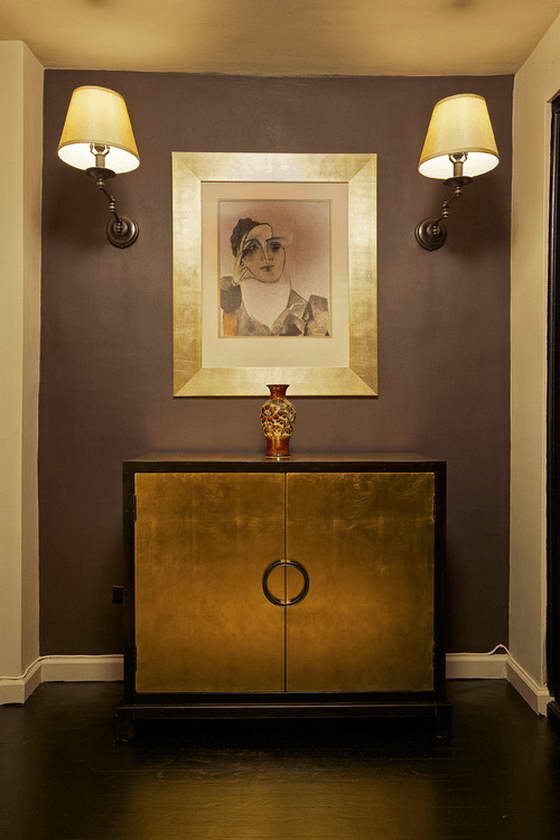 Créé littéralement à partir de rien - une peinture impressionniste et une armoire de style antique de la couleur d'un lingot d'or. L'effet principal est obtenu par le contraste entre le sol et le plafond, et la bordure du mur de la couleur du chocolat noir. L'impression inhabituelle est soulignée par de magnifiques paires de lampes.