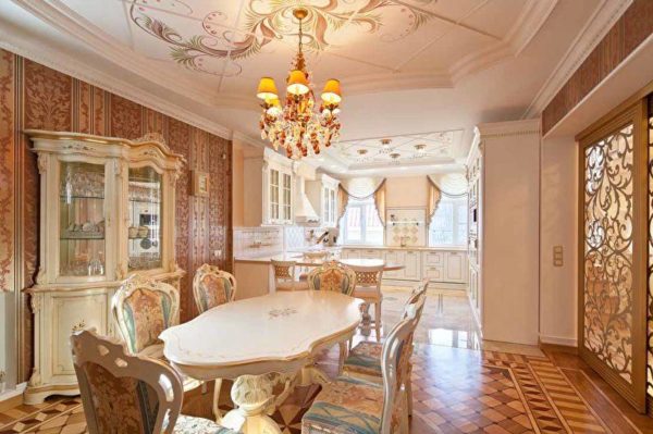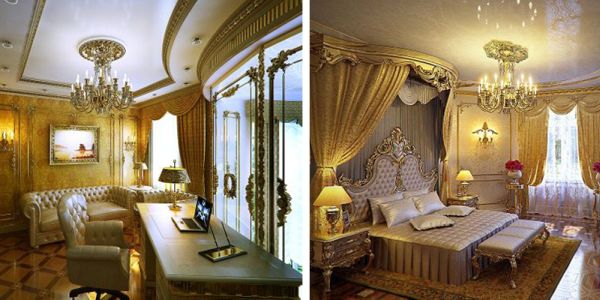 Dans de nombreux cas, afin de ne pas glisser dans la pompe ouverte, l'or et l'or sont utilisés comme moyen d'accentuation - vases en cuivre, cadres en stuc sur les peintures et les miroirs, détails en stuc au plafond et quelques feuilles d'or sur le papier peint.