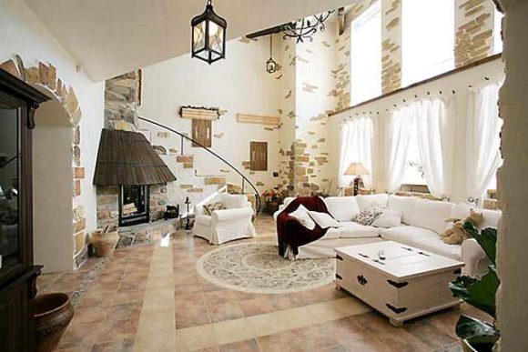Pour les salles, en règle générale, des carreaux stylisés en calcaire, en grès ou en brique sont utilisés. L'imitation sera plus belle si elle est combinée avec du plâtre, boiseries, papier peint gaufré.Les tuiles sont utilisées ici principalement comme revêtement fragmenté. Fière allure dans le salon et le mur de pierre décorative.