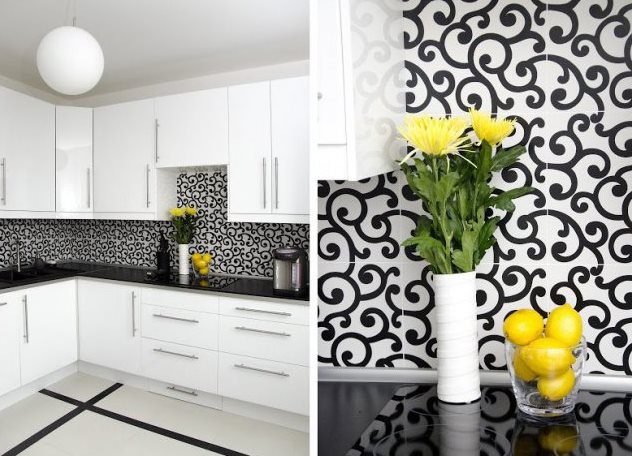 Les surfaces alternées de meubles en noir et blanc sont parfaitement combinées avec un fond noir et blanc, un motif contrasté ou un motif strict. De telles options transformeront la cuisine ordinaire en une salle élégante de l'ère du minimalisme rétro, art déco ou avant-gardiste.