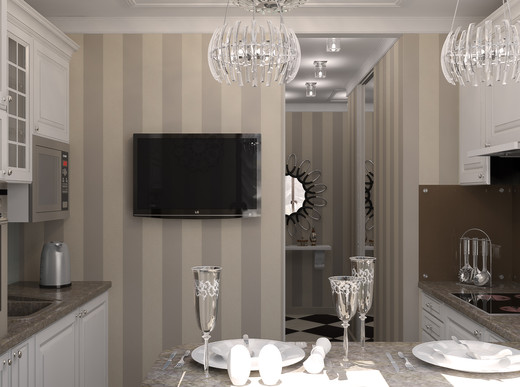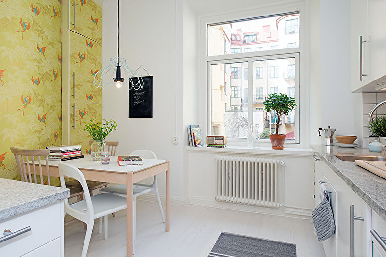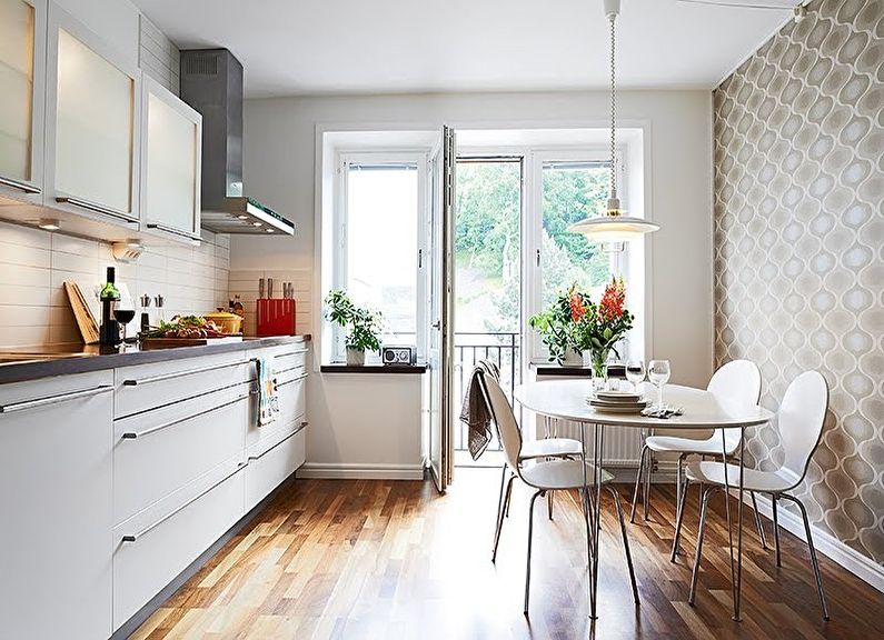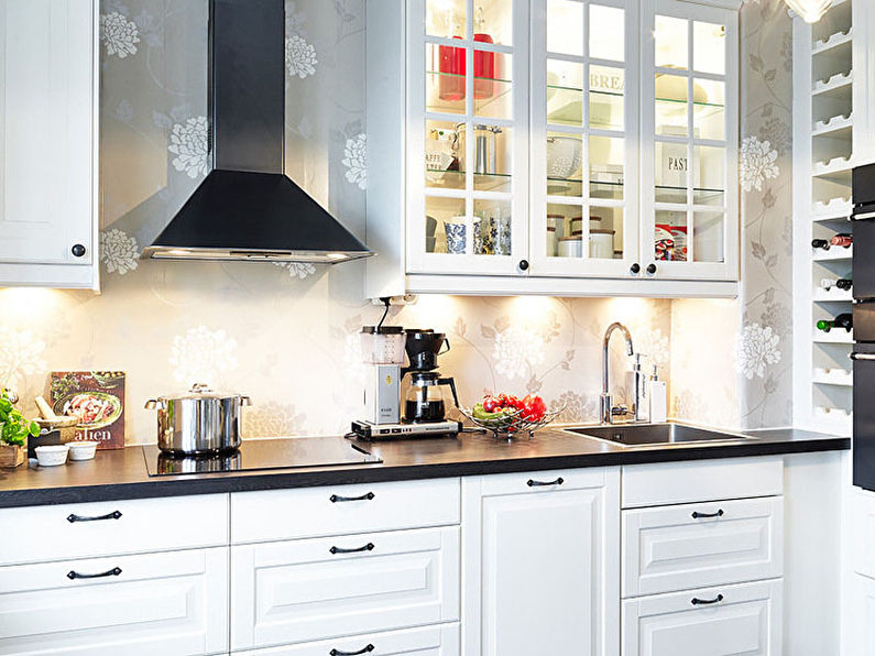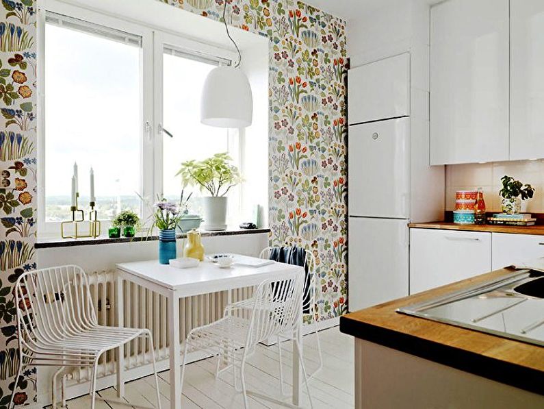 C'est peut-être une nuance qui vous permettra de choisir presque n'importe quel fond d'écran, car le blanc convient à de nombreuses textures, dessins, même photos ou images panoramiques 3D. Lors du choix d'un papier peint, vous devez être guidé par le style et le matériau de la cuisine, vous pouvez voir des nouvelles thématiques sur les conseils de conception.