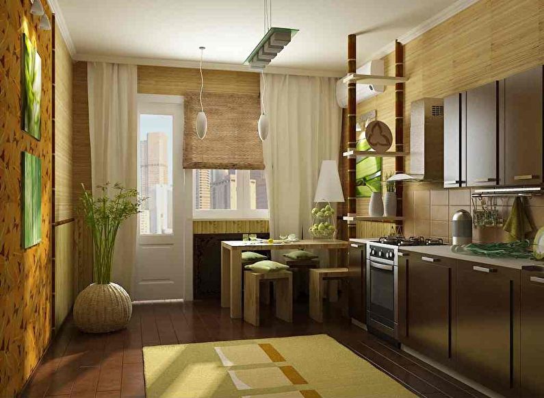 Tous ceux qui choisissent un casque de cette palette de couleurs essaient de donner à l'intérieur autant de luxe et de sophistication que possible. Toutes les nuances naturelles de bois, en particulier avec des notes de tons rougeâtres ou jaunâtres, ont l'air chères et confortables. Cependant, comment choisir le papier peint pour la cuisine en fonction de la couleur du casque, si la couleur principale est cerise, surtout si la pièce est petite?