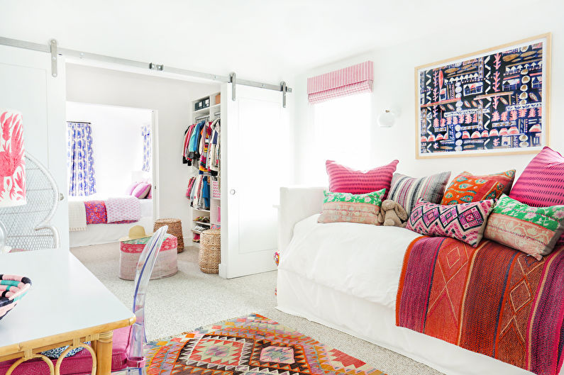 La meilleure solution consiste à utiliser des teintes pastel, par exemple, rose tendre, gris, beige et autres. Si l'adolescente insiste sur des couleurs vives, mais vous pouvez créer un accent lumineux en peignant un mur dans sa teinte préférée. Vous pouvez également utiliser des détails intérieurs lumineux qui peuvent être facilement remplacés.