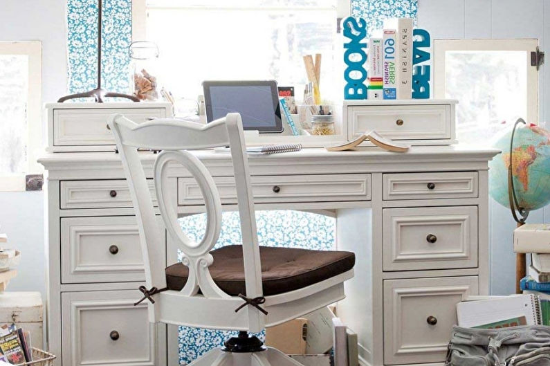La zone de travail doit être confortable et spacieuse. Des tiroirs et des étagères pour ranger les manuels et la papeterie sont nécessaires. Il est nécessaire de faire attention à l'éclairage supplémentaire dans la zone de travail.