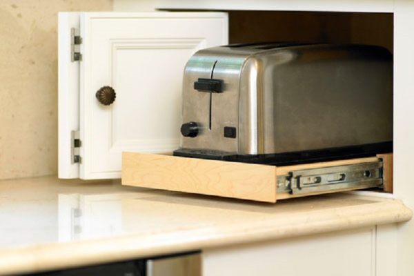 - Une excellente idée pour ranger les appareils électroménagers et toutes sortes de petites choses est une étagère rétractable.