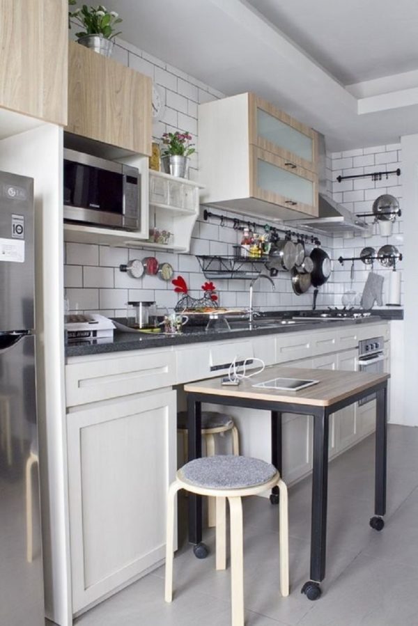 - L'idée de combiner un bureau et une surface de cuisine avec un couvercle spécial pliant est pertinente pour une petite pièce.