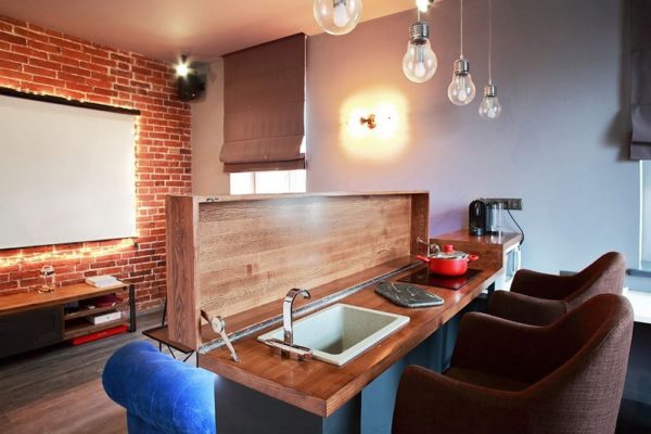 - Un zonage adéquat diversifie la pièce. À l'aide d'un bar, il est facile de séparer la zone de travail de la salle à manger.