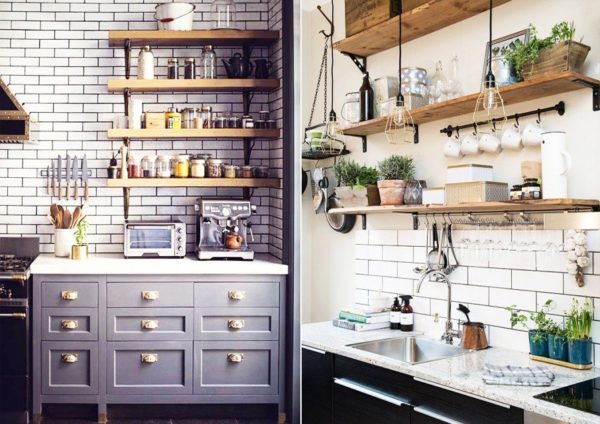 En réfléchissant à la conception de la cuisine de leurs rêves, beaucoup n'envisagent même pas l'option d'étagères ouvertes, mais en vain. Ils donnent une sensation de légèreté et de légèreté. De plus, de beaux plats soigneusement placés sur eux, concentrent l'attention et plaisent simplement à l'œil.