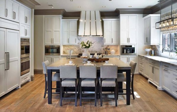 La table de cuisine utilisée pour le travail peut également être située à l'extérieur de l'île, mais elle doit être à proximité. Sur l'île, nous pouvons également organiser un endroit pour manger. Si nous voulons utiliser une telle table en étant assis sur des chaises, sa hauteur doit être de 75 cm.