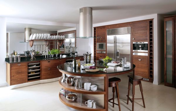 Sur un îlot de cuisine, vous pouvez créer un rack de cuisine avec une étagère ou un placard. Un tel îlot de cuisine sert de comptoir supplémentaire pour la cuisson - également pour plusieurs personnes.