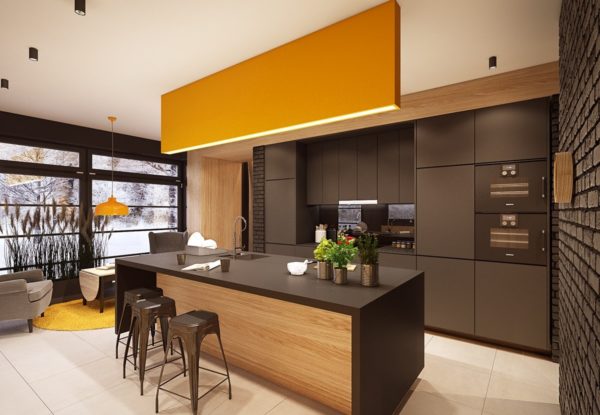 À leur tour, les amateurs de restauration rapide choisiront certainement un bar pratique. Surélevé légèrement du côté du salon, il sera un endroit idéal pour un café le matin ou des conversations en soirée avec un verre de vin. De plus, il couvrira la zone de travail afin que l'harmonie de la cuisine ne soit pas visible pour les personnes dans le salon.