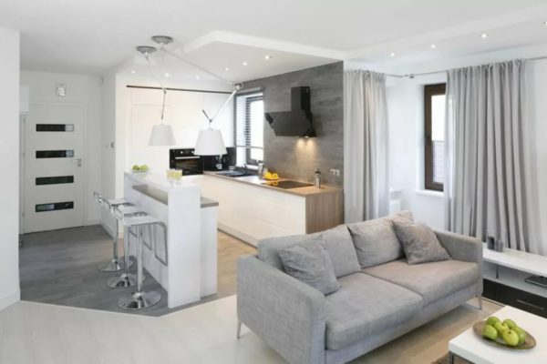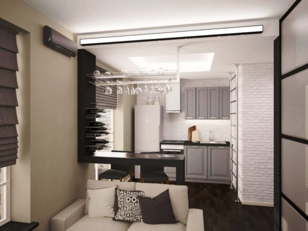 En règle générale, les immeubles d'appartements où un équipement au gaz avec un poêle est installé ne sont pas conçus pour reconstruire et démolir complètement le mur reliant la cuisine et la pièce frontalière. Par conséquent, vous pouvez utiliser la connexion incomplète: remplissez la moitié du mur sous la forme d'une barre, en laissant une large porte. Dans ce cas, le territoire sera plus éclairé, tandis que les segments fonctionnels resteront partiellement déconnectés.