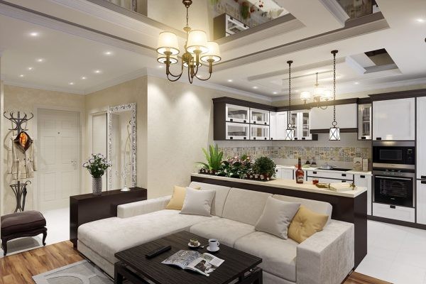 - Faites le bon zonage. L'espace fonctionnel de la cuisine et du salon doit être bien planifié et combiné de manière logique. Il ne faut pas oublier que les pièces sont reliées en un seul "organisme". Par conséquent, une zone doit compléter une autre.