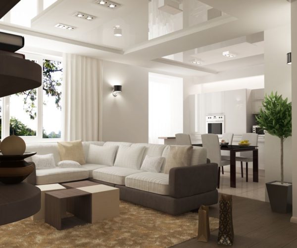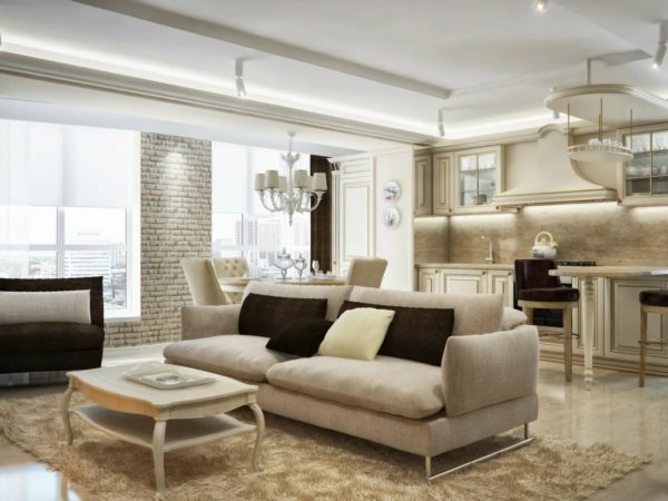 - Pour la disposition correcte des pièces combinées, vous devez décider du style et du design de la future pièce. Ensuite, les principales exigences et souhaits seront réalisés.