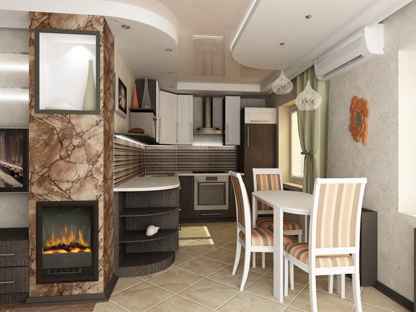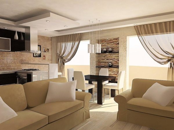 - la méthode la plus utilisée est la démolition du mur séparant le salon de la cuisine. Ainsi, la pièce s'agrandit considérablement, à laquelle le couloir de la cuisine est désormais attaché. Il s'avère une pièce spacieuse avec une niche formée sur le site de la cuisine. La salle à manger est maintenant située entre les fenêtres;