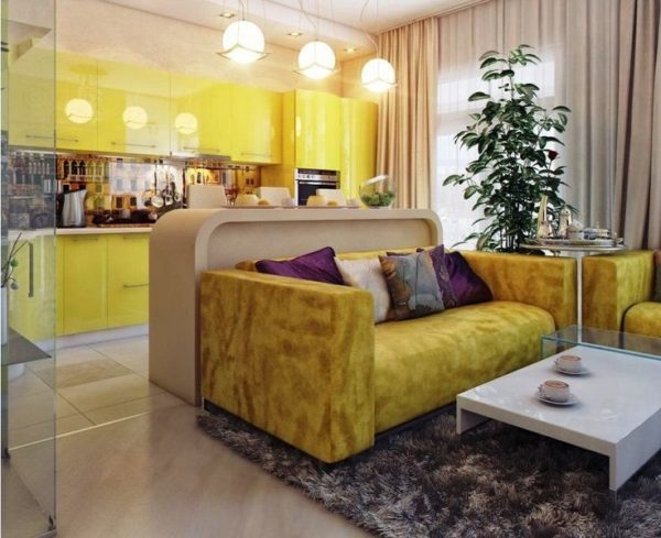- La cuisine du salon peut être séparée par un canapé ou une armoire.Un beau canapé familial ou un mobilier original à plusieurs niveaux aidera à séparer visuellement une pièce d'une autre. L'intérieur entier de la cuisine sera situé derrière le salon.