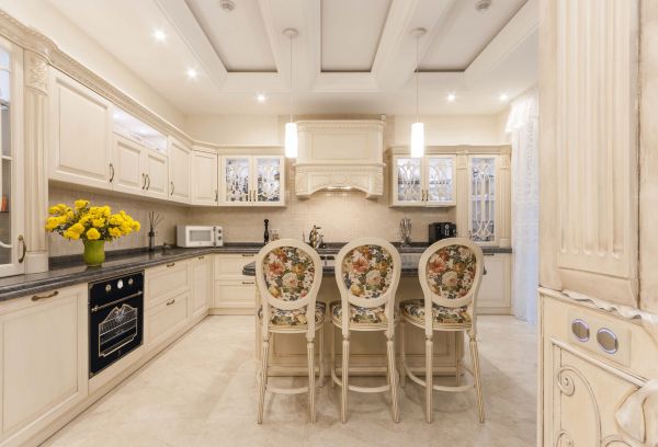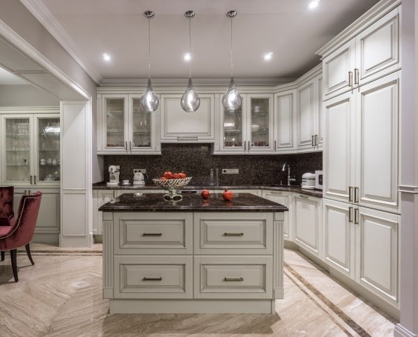Les cuisines classiques comportent des comptoirs blancs ou noirs brillants. Ils utilisent des matériaux naturels tels que le granit, le marbre ou le quartz.
