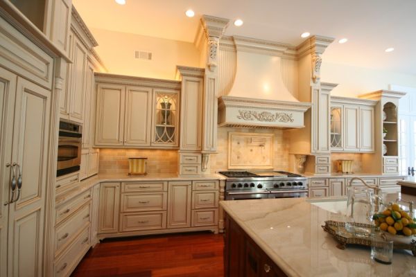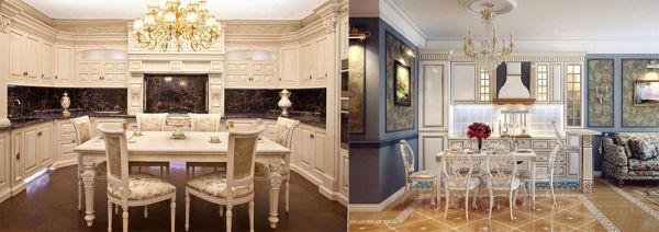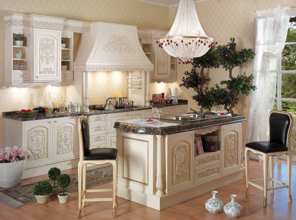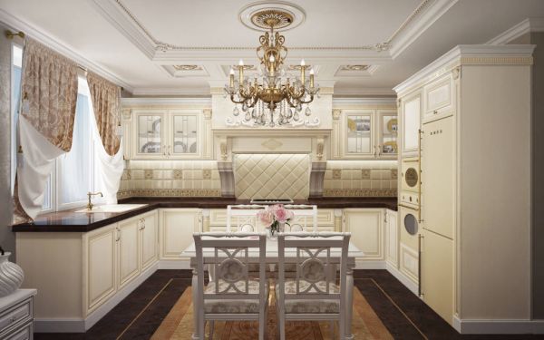 Le lieu de fixation du lustre est généralement défini par une douille avec un ornement en stuc. Sur les murs, il y a souvent une moulure - un détail décoratif, qui ressemble à une planche convexe posée. Une hotte est tapissée de panneaux qui lui donnent l'aspect d'un portail.