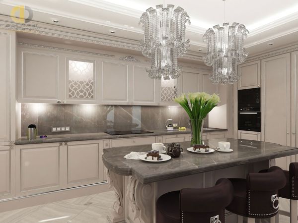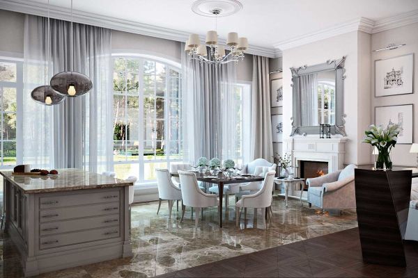 Des détails architecturaux sont également présents sur le mobilier. Par exemple, des tables avec des pieds en forme de colonnes, des armoires à arcades, des corniches et des portiques. Tout cela rend l'intérieur plus volumineux et diversifié.