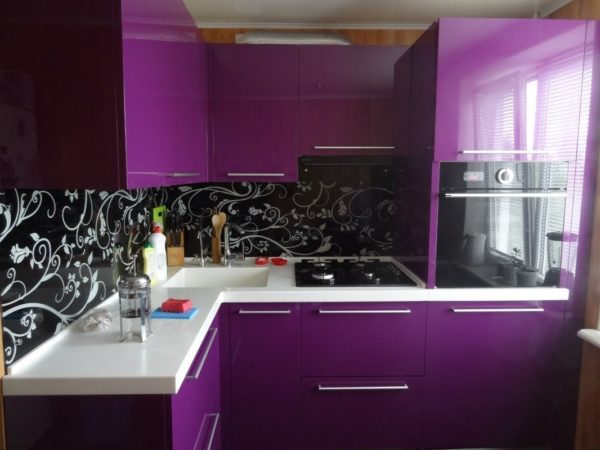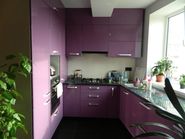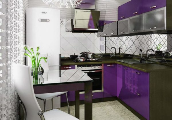 Il a l'air très original et très inhabituel. Mais de telles nuances lumineuses et en même temps sombres s'intègrent dans de grandes pièces ou pour une petite cuisine, mais avec une fenêtre. Si vous voulez vraiment acheter un casque violet, mais que la taille de la pièce est petite, vous devez sélectionner ses nuances claires.