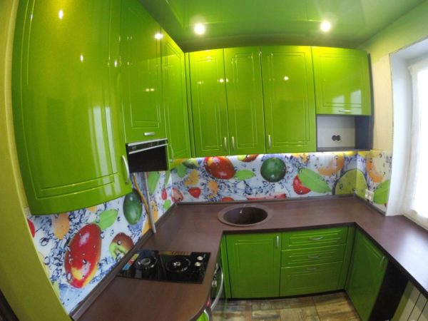 Si le motif de couleur est moins volumineux, la pièce diminuera visuellement. Pour une petite cuisine, un coin cuisine avec des têtes plus petites sur fond clair convient (photo).