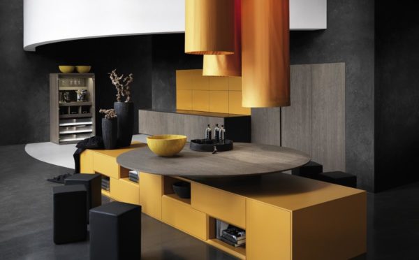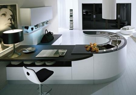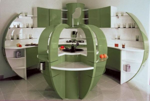 - Une telle cuisine ressemble à un compartiment de vaisseau spatial, grâce à des formes ovales. L'évier est entouré d'une structure qui peut être utilisée pour manger. De plus, il existe de nombreuses étagères pour les ustensiles de cuisine.
