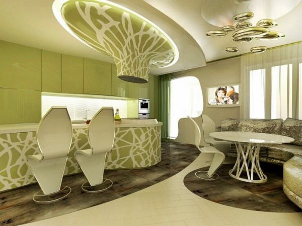 - Juste une sorte d'espace cuisine, et la hotte ressemble à un tuyau d'aspiration. Le mobilier et la décoration sont dominés par des formes ovales et des virages lisses. La couleur olive calme en combinaison avec le blanc crée un sentiment de paix. La lampe ressemble à des gouttelettes de météorites qui sont sur le point de tomber au sol.