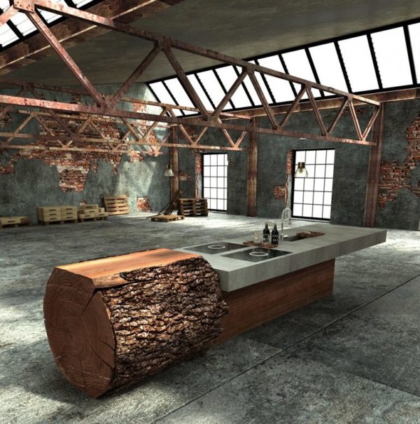- Une idée de design inhabituelle, où la table est faite sous la forme d'un morceau de rondins d'un immense arbre. Et la cuisine elle-même ressemble à une salle de stockage. Sur les murs, vous pouvez voir du plâtre soi-disant écaillé.