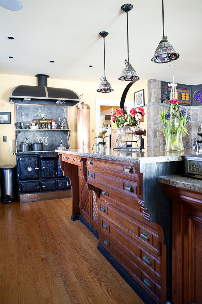 - Lorsque vous entrez dans une telle pièce, vous ne comprenez pas immédiatement qu'il s'agit d'une cuisine. Ici, le style victorien se mêle à l'Art nouveau.