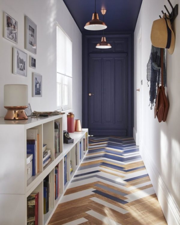 Le tricolore dominant de style denim est une combinaison de beige, bleu et blanc. Le sol et le plafond sont dans une version bleue non conventionnelle, un parquet de couleur qui crée une illusion visuelle de mouvement et des étagères blanches dans le style Art Nouveau.