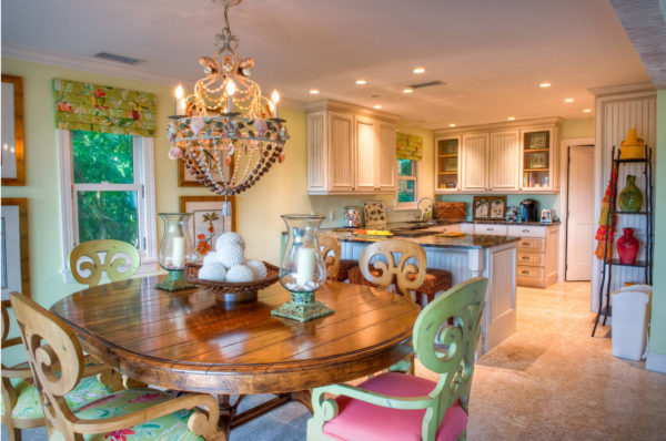 La décision principale a été influencée par le revêtement de sol d'origine, dans lequel toute la palette de couleurs est présente. Pour remplir l'intérieur, il y avait assez de mur en blanc et de chaises pour lui correspondre, une table en bois et une commode en style rétro.