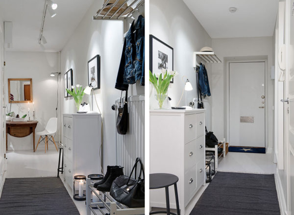 Quelques classiques - impressions dans des cadres sur le mur et des éléments du loft - lampes en cuivre, vases inhabituels avec bordure en cuivre, un long espace raccourci et agrandi.