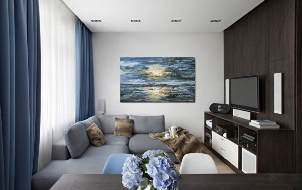 Les concepteurs suggèrent d'appliquer une des deux options. Un des murs doit être peint dans une teinte claire et un canapé d'une teinte provocante doit être disposé dans la pièce.