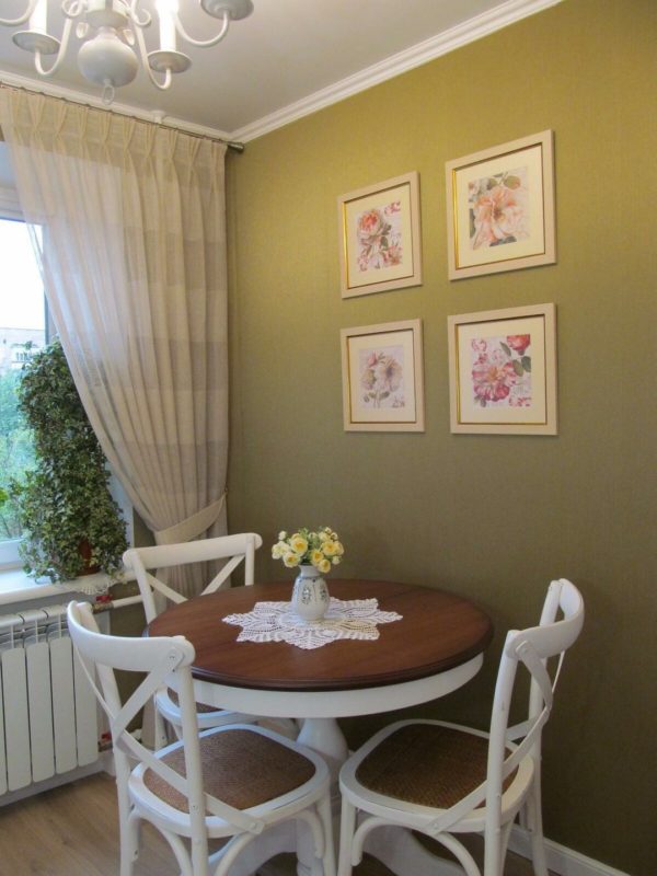 Si vous décidez de rester sur l'option avec un canapé d'angle, la table à manger est choisie ovale ou ronde. En conséquence, les personnes qui quittent la table ne toucheront pas ses coins.