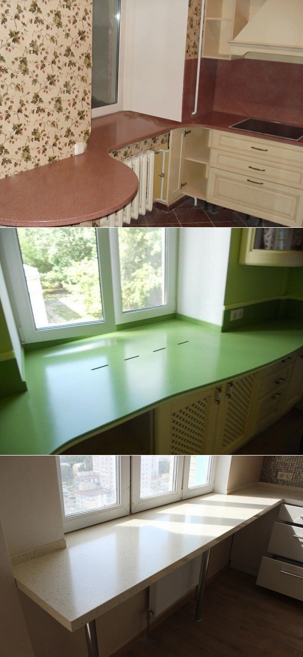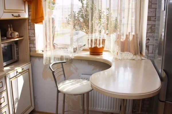 - Le plateau de table peut être placé sur le rebord de la fenêtre. Cette option est idéale pour les appartements avec une belle vue. Mais même s'il n'y a pas cet avantage, vous pouvez toujours réorganiser le rebord de la fenêtre, utilisant ainsi au maximum toute la surface disponible de la cuisine.
