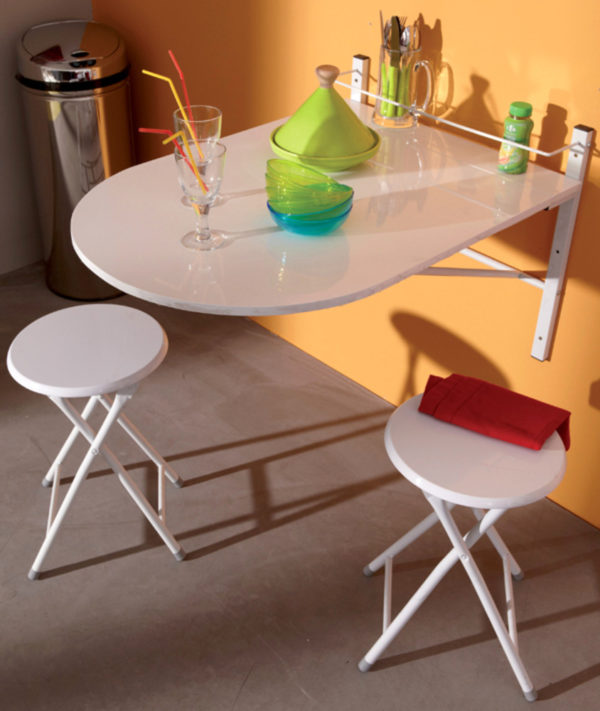 Si 1-2 personnes vivent dans l'appartement, l'option avec une table en forme d'étagère est excellente. Il peut être monté directement dans le mur. Cela se traduira par un goulot d'étranglement qui ne prendra guère de place. Les petites dimensions d'une telle table sont destinées uniquement aux collations rapides sur le pouce et aux petits déjeuners légers.