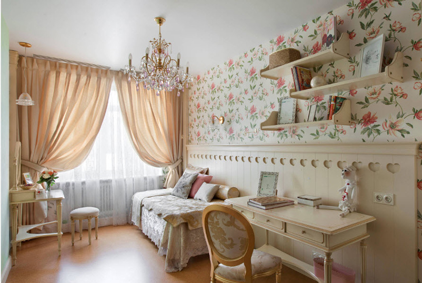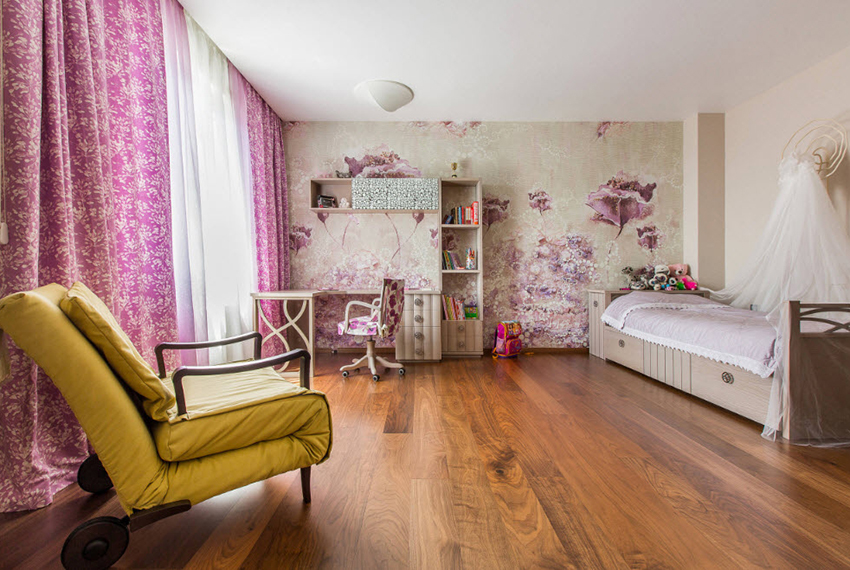 La pièce sera originale si vous diluez le papier peint de n'importe quelle couleur avec du papier peint photo et des rideaux contrastants. Ne collez pas de papiers peints brillants de teintes acides, afin de ne pas surcharger psychologiquement l'enfant. Et si vous voulez que la fille devienne plus optimiste et énergique, collez le papier peint en bleu, combiné avec le vert, le rose avec le brun, le blanc avec l'orange discret.