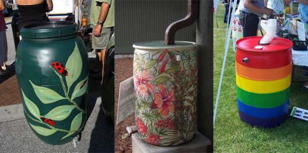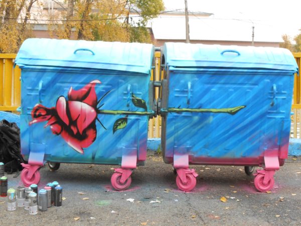 Vous ne pouvez pas vous passer de poubelles dans le chalet d'été, mais pour qu'ils ne gâchent pas tout le paysage avec leurs vues, ils doivent également faire attention. Par exemple, vous pouvez les décorer avec des autocollants sous forme de tulipes, de tournesols, de marguerites et d'autres fleurs.