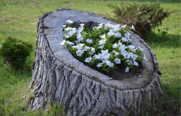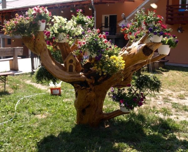 Si des souches d'arbres fruitiers sont restées dans le pays, vous ne devriez pas vous précipiter pour vous en débarrasser, car si vous les saturez avec un antiseptique et un vernis, vous pouvez obtenir un parterre de fleurs original.